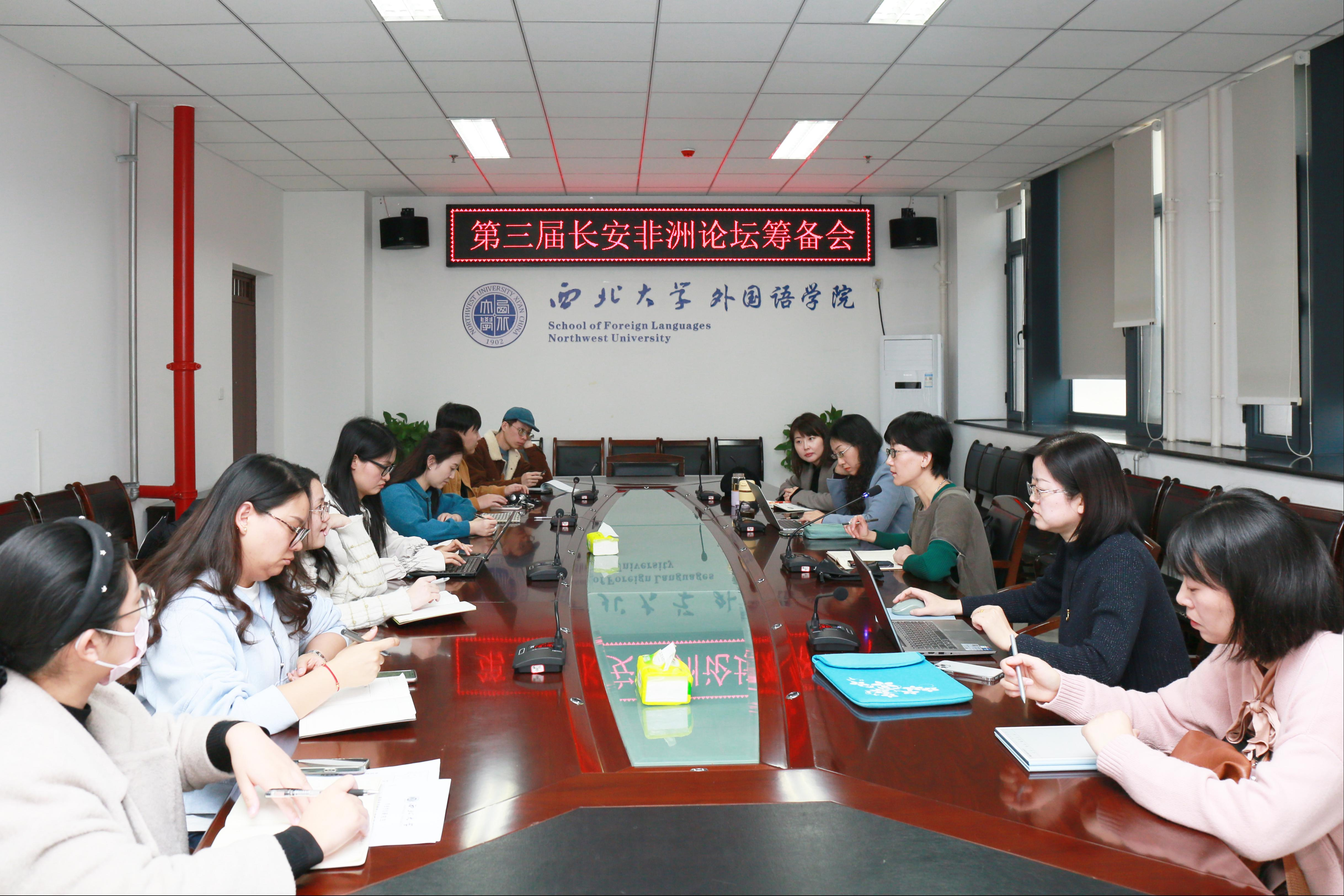 On the afternoon of November 29, 2023, the School of Foreign Languages held the Third "Chang'an Africa Forum" preparatory work progress meeting, chaired by Dean Cao Ruonan. Members of the forum preparatory group and relevant personnel attended the meeting.