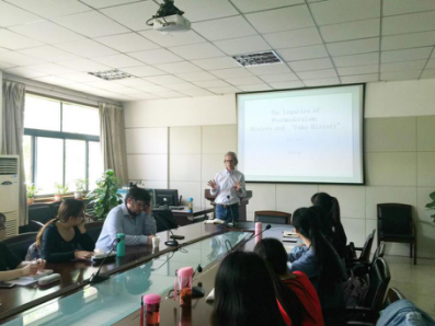 报告中Aled Jones教授从历史学的角度为学生们深入讲解了后现代主义文学理论的历史起源、理论发展的重要时期、后现代主义风潮对艺术人文等社会各方面的影响、以及其引起的文化转型。会后Aled Jones教授和全体学生进行了热烈的学术探讨与互动。