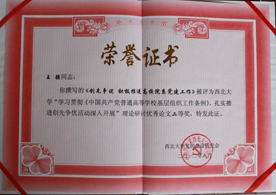 6月26下午,校党委在太白校区大礼堂隆重召开学习贯彻《中国共产党普通高等学校基层组织工作条例》,扎实推进创先争优活动深入开展征文活动表彰大会。王强书记撰写的《创新争优 积极推进高校院系党建工作》被评为优秀论文二等奖,安辉老师撰写的《高校党建工作途径新探——党建带团建的几点思考》和2009级本科生张阳撰写的《新时期 新发展 新要求——结合“十七大”浅谈大学生党组织建设》均荣获三等奖;我院党委荣获优秀组织奖。